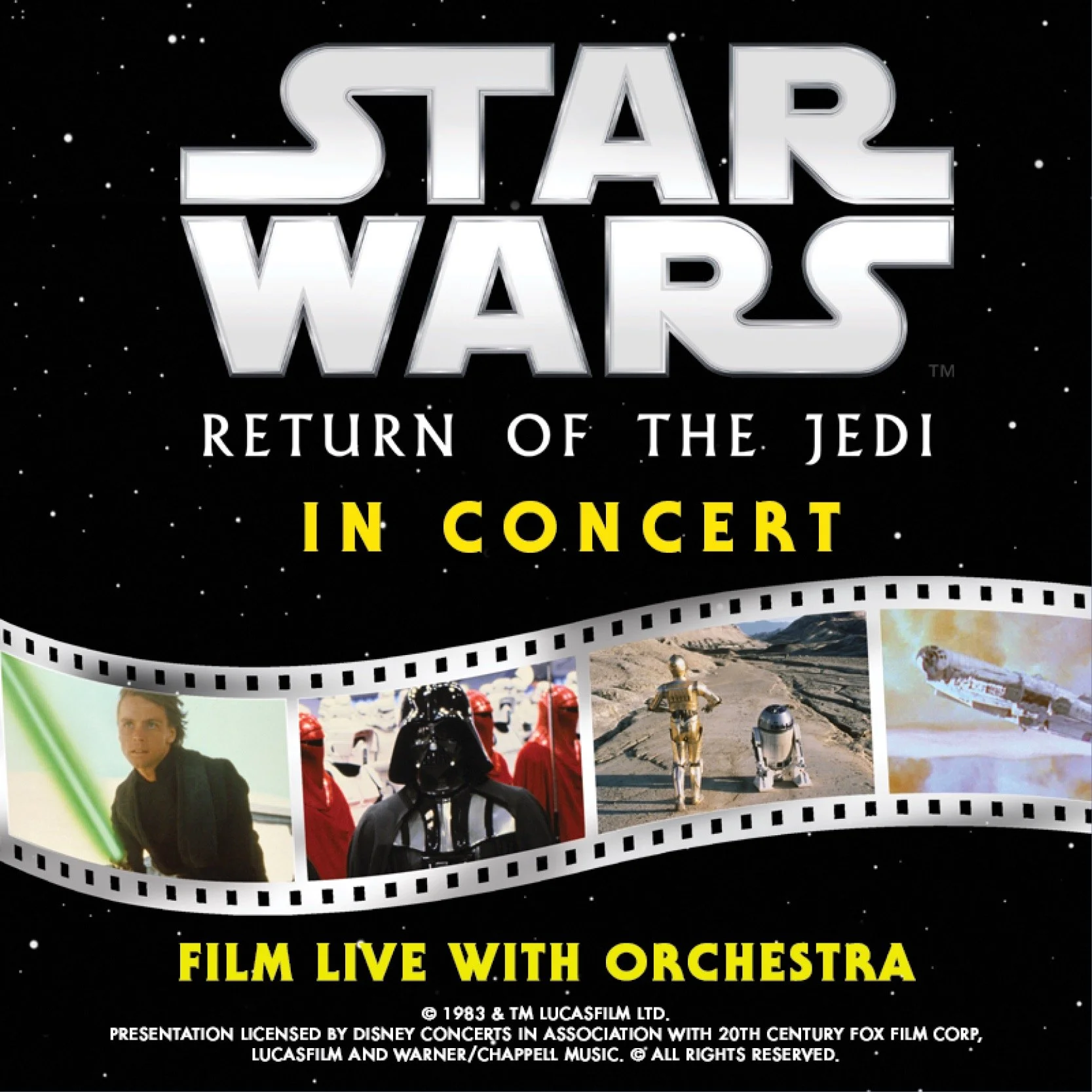 In the climactic sixth episode of the Star Wars saga, Darth Vader readies the second Death Star to unleash the final blow to the Rebel Alliance. Luke Skywalker joins Princess Leia to free Han Solo from Jabba the Hutt and launch a desperate attack upon the entire Imperial Fleet. Watch the complete film unfold as we perform John Williams’ legendary score live to the film.